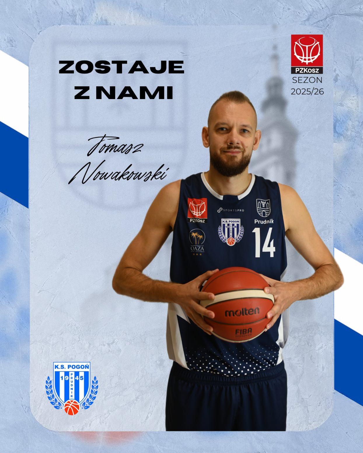 Nowakowski przez te wszystkie lata zaskarbił sobie sympatię prudnickich kibiców. Tomek szybko stał się kluczowym zawodnikiem biało-niebieskich. W minionej kampanii wystąpił w 34 spotkaniach, spędzając na parkiecie śr. 26 minut, w tym czasie notując 13,6 punktów i zbierając 7,6 piłki na mecz. "Nowy" rozegrał w Pogoni ponad 300 spotkań, zdobywając 3767 punktów.